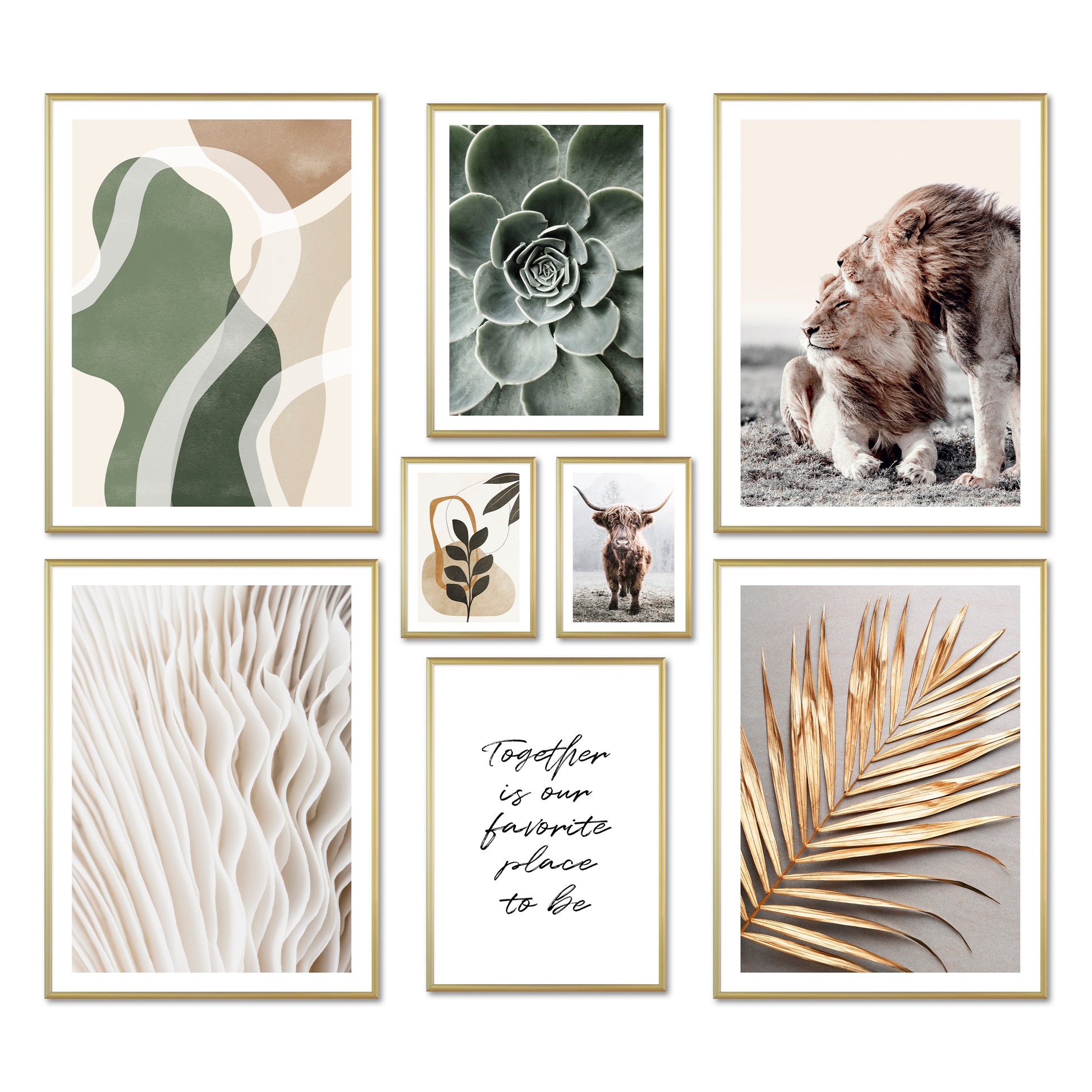 Discover the fascinating beauty of nature and wildlife with this unique set of images. From the detailed structure of a beige mushroom to the vibrant green tones of a succulent to the golden sheen of a botanical leaf – each motif tells a story. Be impressed by the power of the companionship of two lions and feel the harmonious connection in an abstract illustration with green leaves. Encounter the majestic presence of a Highland cow and let the inspiring quote "Together is our favorite place to be" touch your heart. Abstract shapes in beige, green, and brown open up space for your own interpretations. Immerse yourself in this emotional journey that connects you with nature and touches your senses.