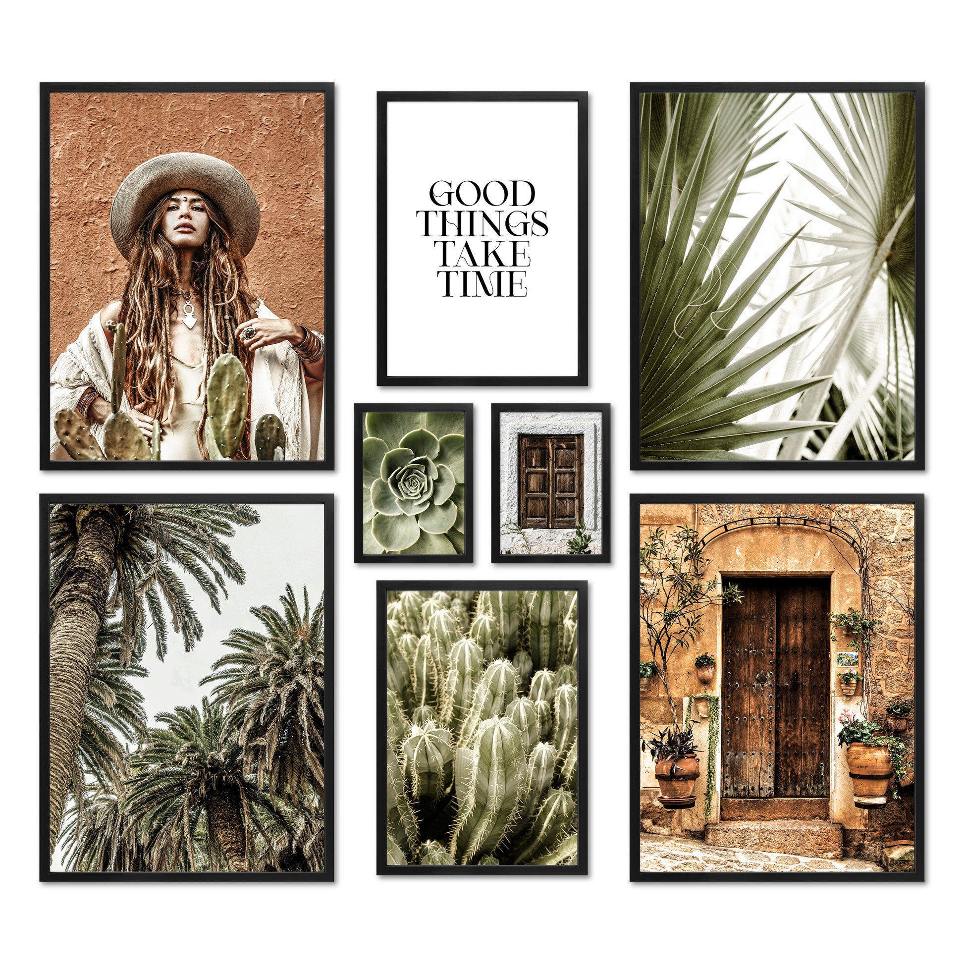 The color palette of terracotta and green gives these motifs a natural yet vibrant feel. The quote poster "good things take time" reminds you that the best things in life take time.