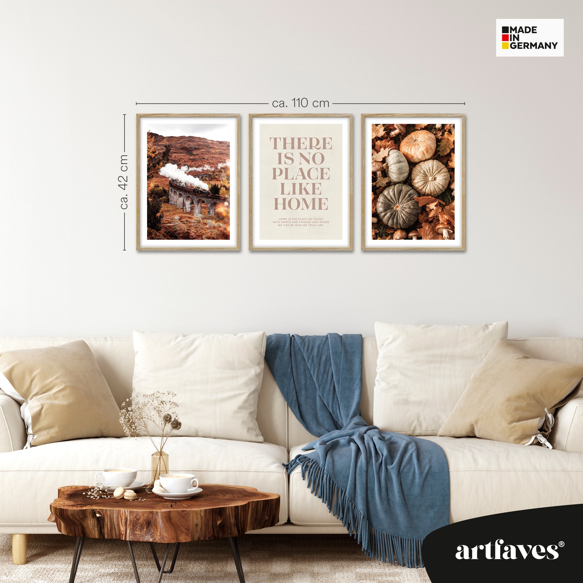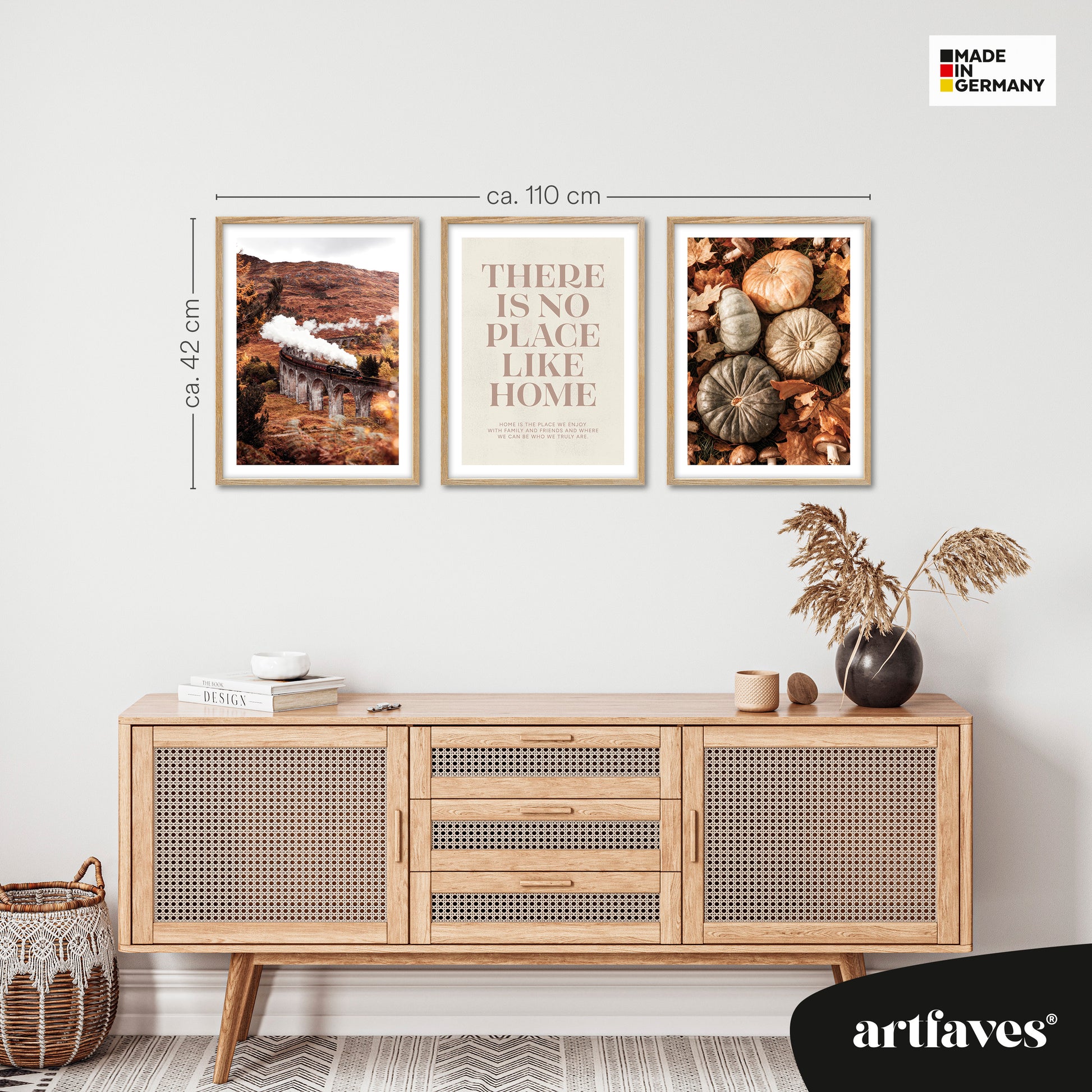 Spüre die warme, goldene Stimmung des Spätherbstes mit dem Herbst Momente 1 Poster Set – eine liebevolle Kombination aus Natur, Nostalgie und Geborgenheit. In harmonischen Orange-, Braun- und Grüntönen fangen die Fotografien die Schönheit dieser Jahreszeit ein: der Dampf einer alten Eisenbahn, die majestätisch über das Glenfinnan Viaduct fährt, die Vielfalt herbstlicher Kürbisse zwischen buntem Laub und Pilzen und das Spruchposter „there is no place like home“, das an das Gefühl von Heimkommen und Wärme erinnert. Dieses Herbst Poster Set bringt Gemütlichkeit und natürliche Eleganz in dein Zuhause und schafft eine ruhige, behagliche Atmosphäre – perfekt für kalte Tage und kuschelige Abende. Ideal als Wanddekoration für Wohnzimmer, Flur oder Küche – für alle, die den Charme des Herbstes und das Gefühl von Zuhause lieben.