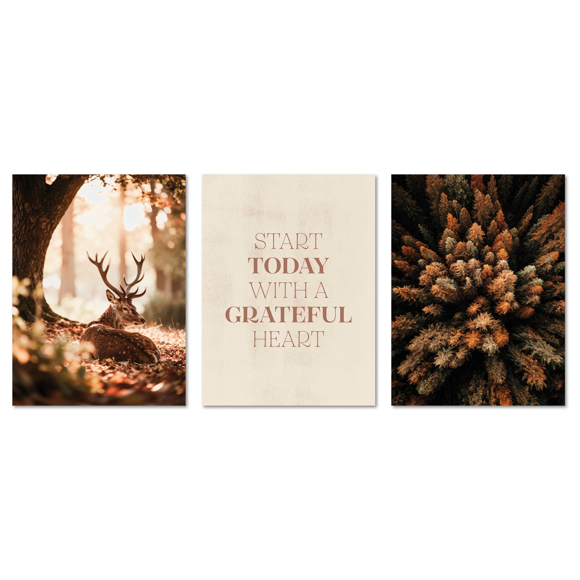 Tauche ein in die goldene Stille des Waldes mit dem Herbst Wald Poster Set – eine harmonische Kombination aus Natur, Ruhe und Achtsamkeit. In warmen Orange- und Brauntönen fängt dieses Set die Magie des Herbstes ein: ein majestätischer Hirsch steht unter einem alten Baum, während sich das bunte Blätterdach eines herbstlichen Waldes aus der Vogelperspektive zeigt. Das Zitat „start today with a grateful heart“ rundet das Set ab und erinnert jeden Tag daran, dankbar und achtsam zu leben. Diese Herbst Poster bringen natürliche Wärme und Gelassenheit in dein Zuhause und sind die perfekte Wanddekoration für alle, die den Zauber der Jahreszeiten und die Ruhe der Natur lieben. Ob im Wohnzimmer, Schlafzimmer oder Büro – das Herbst Wald Poster Set verwandelt jeden Raum in eine gemütliche Wohlfühloase.
