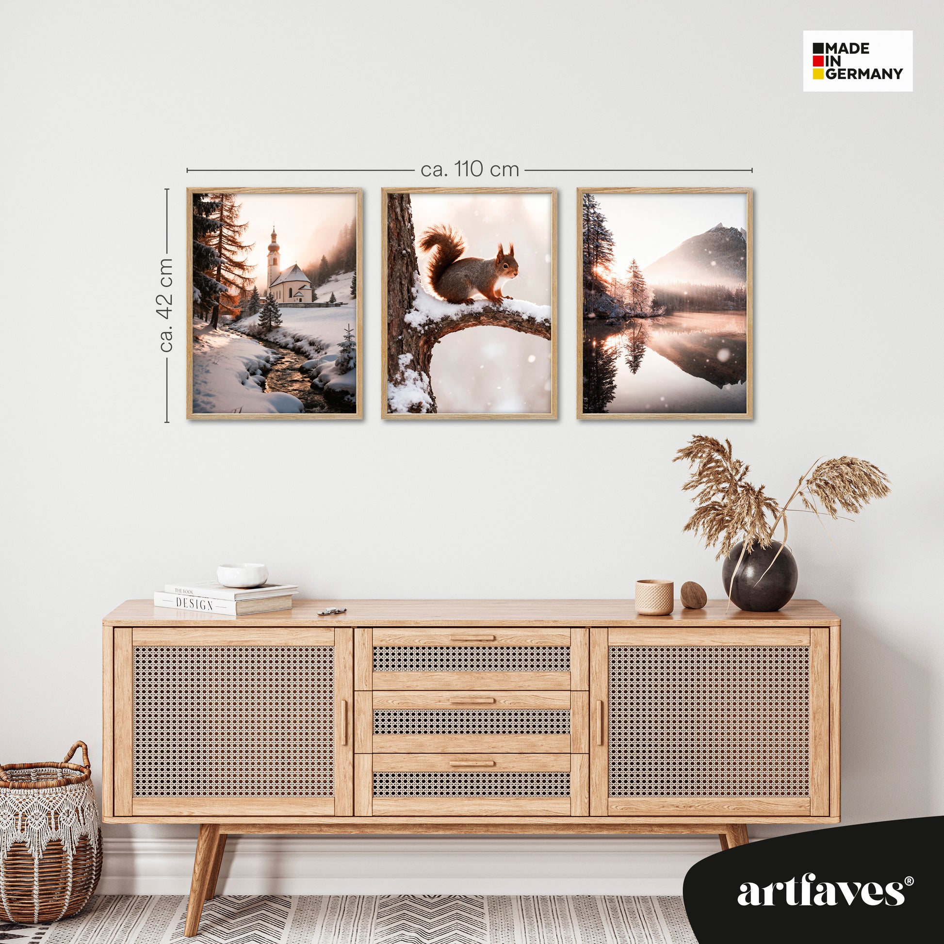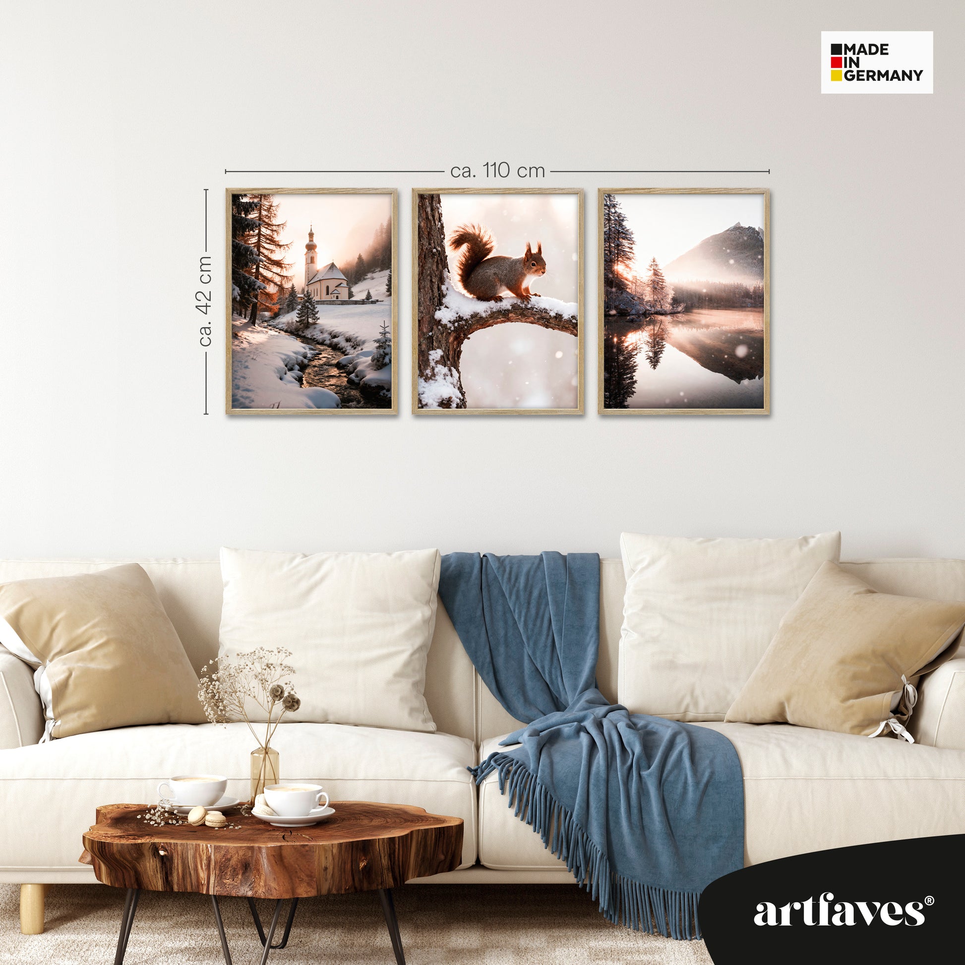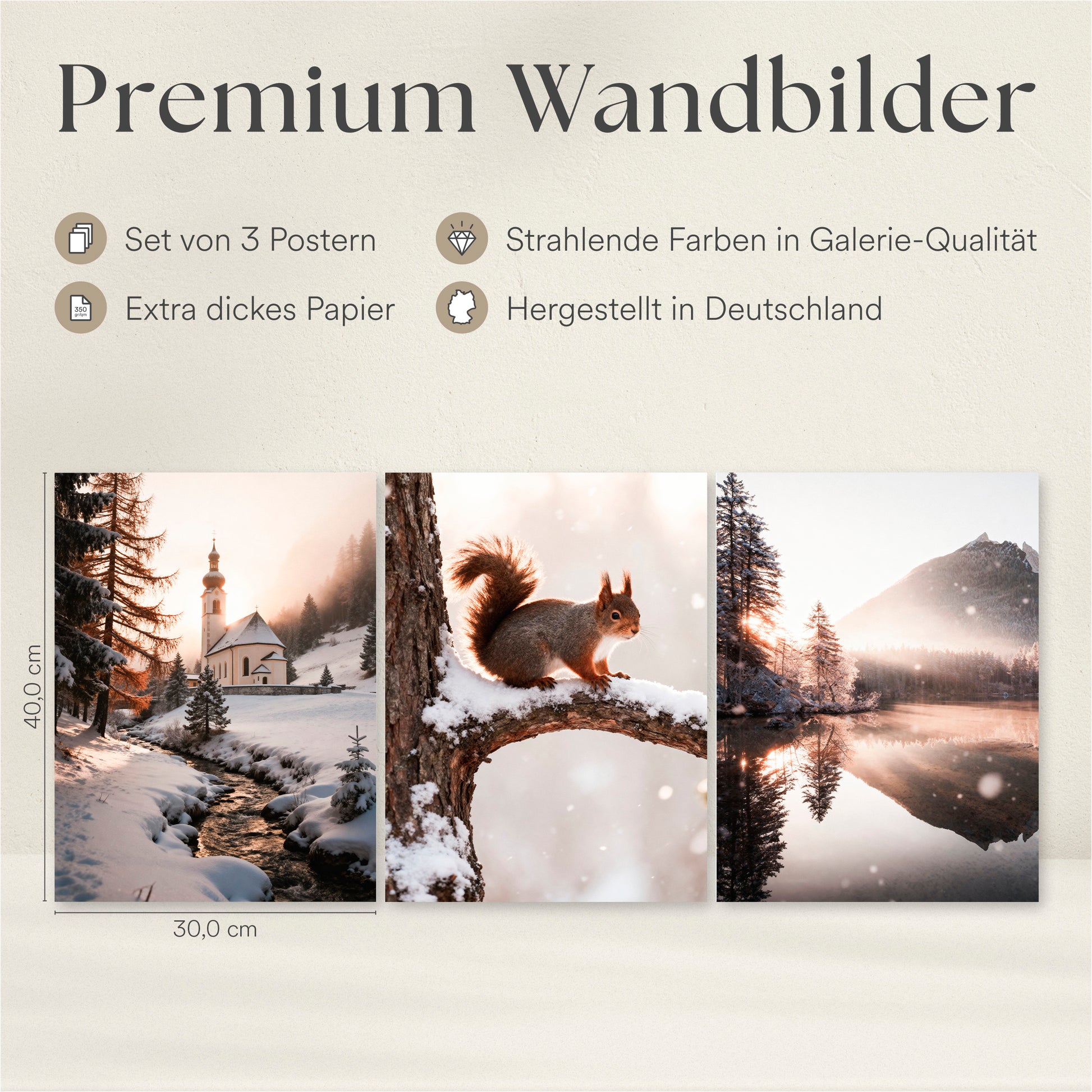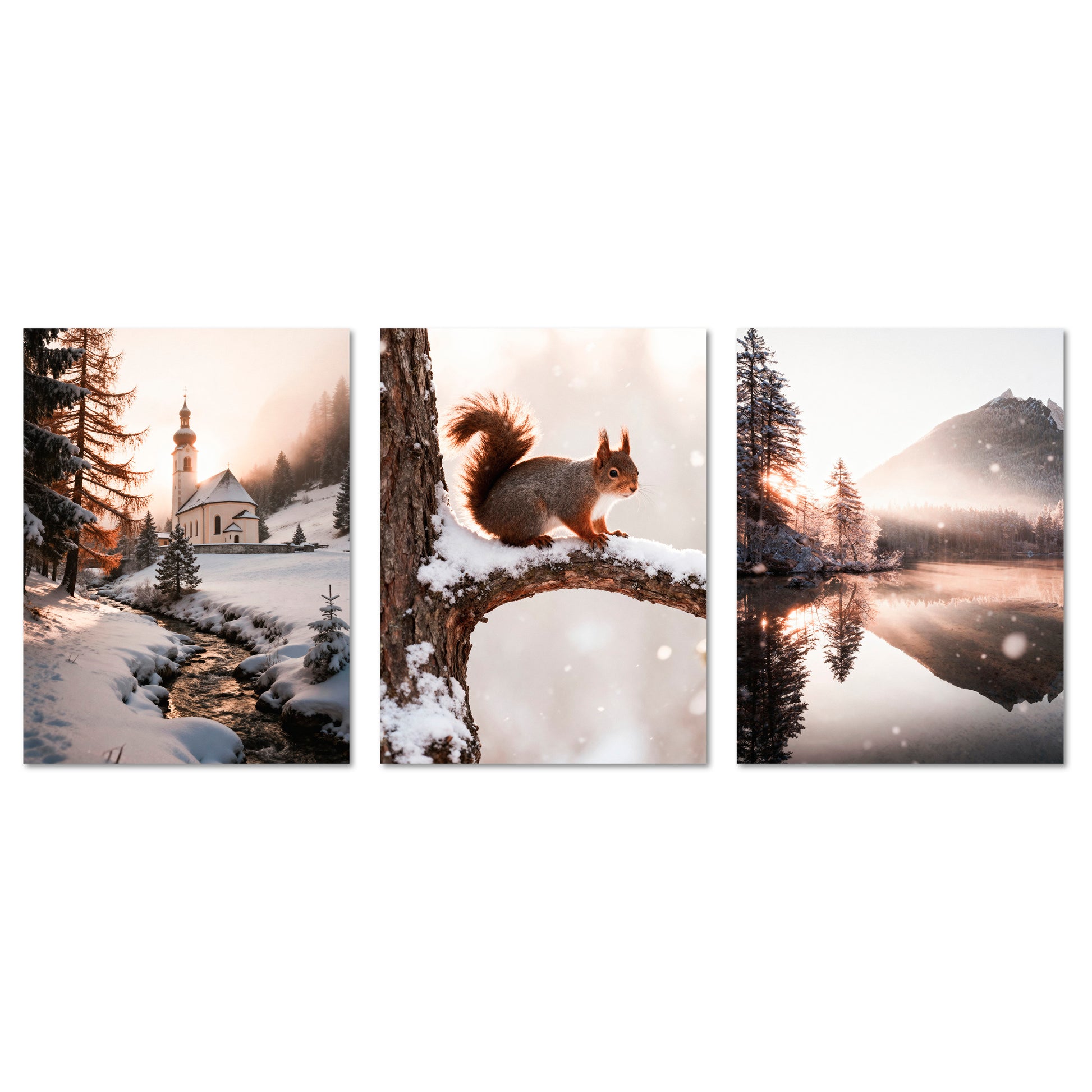 Poster Set - Winter Momente 2 - 3 Deko Wandbilder Kirche Eichhörnchen See